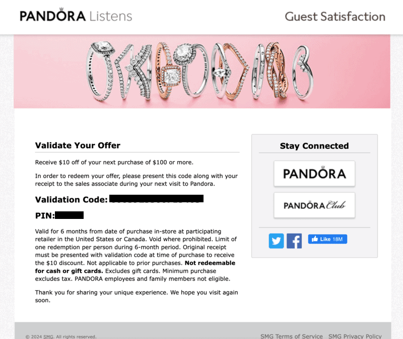 NO! It is super easy to redeem the coupon from Pandora! Just write your validation code on your receipt after you take the survey and the next time you make a purchase at Pandora present your receipt with your validation code to the employee at checkout and they will honor the $10 off your purchase of $100 or more.